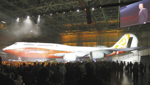 北京时间2月14日凌晨,全新波音747-8洲际客机首次亮相。至此,波音终于推出了与空客A380正面交锋的机型。分析人士认为,747-8洲际飞机短期内市场反应恐逊于空客A380,不过这一新机型对航空市场新一轮市场竞争的展开具有重要意义。值得注意的是,在波音747-8型飞机制造中,中国企业扮演着非常重要的角色。西飞、成飞和洪都航空均为747-8项目提供了机身部件。 (详细报道见第3版)商报记者 肖玮/文 新华社/图 李烝/制图