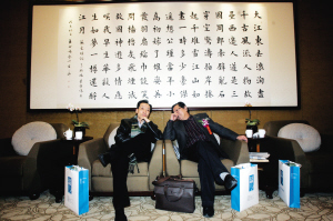 | 中国记协党组书记翟惠生(左)和中国经济报刊协会会长冯并探讨如何深入进行报道 |