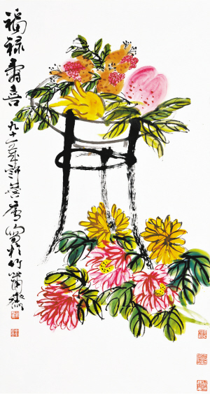 《福禄寿喜》是画家以物寓意抒怀的精品之作。此幅作品熔意、趣、法于一炉,三者相得益彰、浑然一体。画中菊花以藤黄、曙红、花青等巧妙布色,配以浓淡相宜的墨线勾勒,沉稳而不失生机,而画面上方的寿桃、石榴以没骨大写意法直接泼写,再以花青、赭墨写出叶子和枝干,后用浓墨勾勒叶筋,设色浓重艳丽。画秋菊、寿桃,意为“益寿延年”,石榴则为多子多孙之意。
