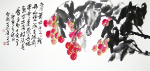 他擅画荔枝,它们都是画家人生感悟的寄寓,人生喜怒哀乐的寄托。他用大写意画法画荔枝,独具个性。这幅《荔枝图》用水墨点染树叶,用泼墨渲染果实,用古拙的涩笔将枝干一笔勾出,整幅作品躯干苍劲,树叶婆娑,色泽圆润,蕴含一种旺盛的生命力。