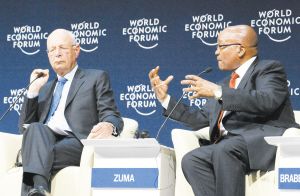 4日,在南非开普敦,南非总统祖马(右)在第21届世界经济论坛非洲会议的开幕式上讲话。