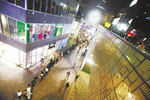 iPad2今日在中国内地发售,而在昨日下午,西单大悦城、三里屯苹果直营店的门前就开始有人排队。黄牛党动用人海战术,雇佣学生6点下课以后以每人50元的价格通宵等候。排队长龙几乎将半个三里屯南区广场占据,队伍一度长达150米。图为昨日21时在三里屯苹果直营店前等候购买iPad2的人群。商报记者 暴帆/文并摄