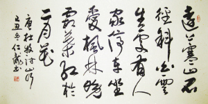 郑仁龙的这幅《山行》,从墨的神韵到字的结体,从字与字之间的处理关系到整幅作品的谋篇布局,既承接前人的血脉,又有他自己的风格和特点,这得益于他对舞蹈艺术的研究,将其有意无意地转移于书法之中的缘故。舞蹈讲究精气神,讲究行止腾挪环节之间的圆润,讲究流畅与和谐,讲究动作之中含蓄与夸张、放开与收拢,讲究舞蹈画面和队形的平衡与打破平衡,对称与打破对称,整齐与打破整齐,这些都不知不觉地作用着他的书法。故而看他的这幅作品,有着坚挺的骨骼、俊美的轮廓和丰满的品貌;通篇来看,洋洋洒洒,酣畅淋漓,有疏密,有揖让,有动势,有跌宕,如翩翩舞姿,串串音符,能见其态,能闻其声。