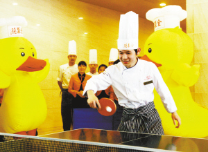 5月14日,由全聚德望京店赞助的“第五届望京街道快乐健身体育文化节”拉开序幕。在当天举办的“全聚德杯”乒乓球大赛上,300多名社区居民踊跃参加,最终产生的前三名选手获得了数额不等的全聚德望京店就餐体验券。