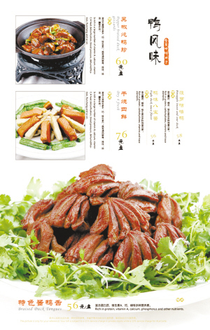 此外,在将“全聚德芥茉鸭掌”、“全聚德火燎鸭心”、“全聚德小鸭酥”等全聚德贯标菜发扬光大的同时,为了适应杭州消费者的饮食口味和习惯,全聚德杭州店采取入乡随俗的办法,在菜式上和菜品的口味上做了适当的调整和创新。又根据杭州顾客的口味及需求推出了杭帮菜、川菜、粤菜、沪菜等备受广大顾客欢迎的精美菜品,并在菜品质量和服务质量上体现出“全聚德”的品牌风范,为杭州的餐饮市场注入传统文化与现代餐饮理念相融合的新理念。