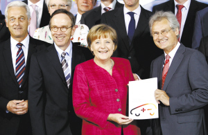 16日,德国“国家电动汽车平台”顾问委员会主席孔翰宁(右一)在柏林向总理默克尔(中)提交报告。