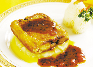 制作方法:1、将银鳕鱼沾上面粉煎熟;2、将菠萝片垫底鳕鱼放在上面,用番茄沙司加百里香做汁即可。
