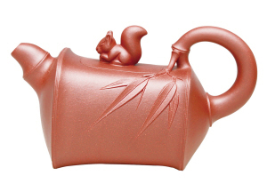 宜兴产竹,著名的竹海是宜兴的旅游胜地,也是艺术家寻找灵感的最佳所在。不过,同样的景物对于不同人的启发也不尽相同,孙立强与刘群创作的“竹趣”就是一件打破常规的竹器佳作。这是一把动静相融的茶壶,一改圆形的壶身,改用长方立体形,壶身就好似一根很粗的竹节,纹路明显丰富,壶把壶嘴是小的枝节,壶把处的枝叶延伸到壶身上,几片竹叶犹如在风中飘荡,壶钮做成了小松鼠,站在竹上啃咬着坚果,栩栩如生,加上整件作品竹的意趣,将主题中的“趣”字体现得淋漓尽致、呼之欲出。 孙立强擅长竹器,但“竹趣”显然已突破了简单竹器的范畴,不单纯是某一种器型,而是捕捉到生活中的闪光点,把瞬间变成了永恒的艺术语言,在体现生活真谛的同时,也表达了人与自然和谐共处的诉求。