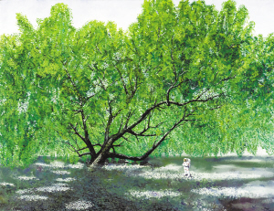 这种困惑的情绪或许从他带有“青春期”特点的绘画作品里就可窥见一些端倪,在比例上,与画面的小人物比较,作为叙述背景的场景此时变成了极其巨大与无限延伸的空间,同时人物外貌形象或行为状态与身处场景是不协调的,甚至可以说是突兀。比如他今年的新作《脐带》,一片具有典型西伯利亚地域特征的白桦林中,忽然冒出了几个貌似穿着太空衣的小人,他们之间隐约有白色的线状物体维系,尽管无法看到他们的具体神情,但看久了仍能感受到一缕迷惘与惆怅的情愫潺缓而出。这也暗合了艺术家对于自我存在、社会身份的反思,于大明认为每个生活在社会中的人作为个体,与急剧而下的历史洪流相比,只不过是一粒粒的沙子,不可避免地影响与受制于所处的时代,从某种意义上说,每个个体最终都要湮没在这个洪流中,但也是不同的个体共同组成整个社会的意识形态。