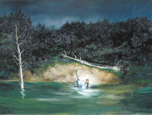 于大明的困惑情绪或许可从其带有“青春期”特点的绘画作品“沉默”系列里稍见端倪,在比例上,与画面的小人物相比,作为叙述背景的场景此时变成了极其巨大与无限延伸的空间,同时人物外貌形象或行为状态与身处场景也不协调,甚至可以说是突兀,艺术家以这种别样的艺术语言彰显内在的奔突。