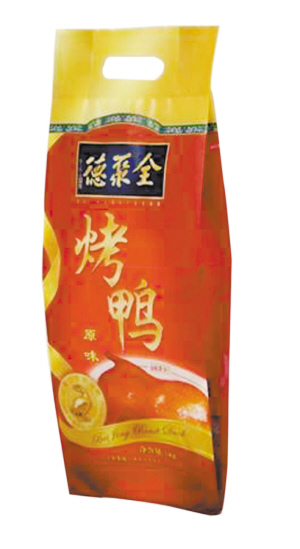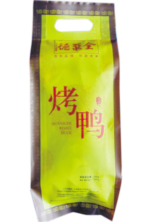 外包装:市场投放的全聚德原味真空烤鸭有两种包装:1000g真空烤鸭、500g真空烤鸭。(上图)如果在市场中发现售卖的全聚德原味真空烤鸭产品不是上述两种包装,则可以认定该产品为假冒产品。