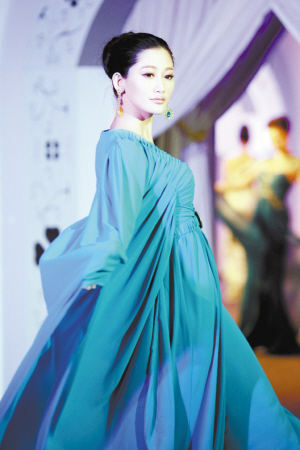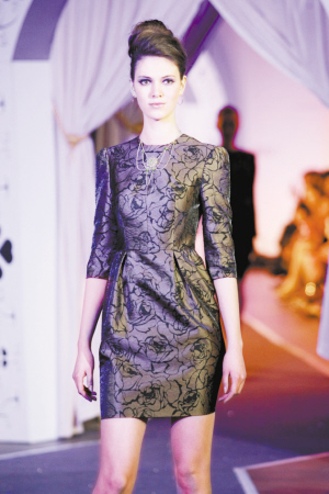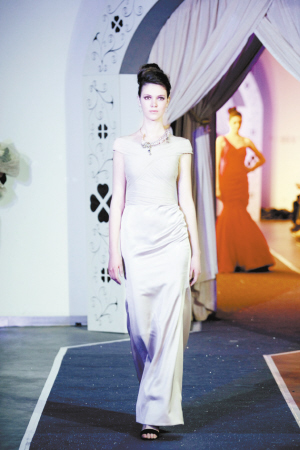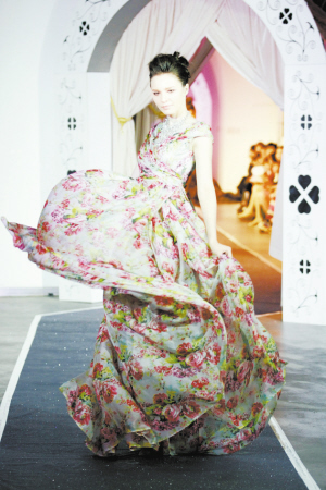 根据春夏季流行趋势,制作了一批以单肩丝缎礼服、雪纺飘逸礼服为主调的产品展示。其中,以数码印染的各色豹纹、蟒蛇纹路的雪纺制作的大礼裙,充满了内敛的野性之美,魅惑而高贵。而以浪漫花朵图案数码印染的雪纺礼裙则展现了女人极致的甜美和浪漫。压轴的两件真丝雪纺长礼服使用了色彩饱和度极高的松石兰色,搭配以四叶草形状的手工限量蕾丝,并装饰以绿松石宝石胸针和腰带。