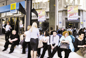 希腊财政部长乔治·帕帕康斯坦蒂努24日表示,该国已经决定立即进行出售政府所持希腊邮政银行、电信服务提供商OTE、雅典港口和塞萨洛尼基水公司的资产,旨在推进其总额500亿欧元的私有化项目。这一出售国有资产的计划遭到强烈抗议。图为职工聚集在希腊邮政银行总部大楼外抗议出售国有资产。东方IC/供图
