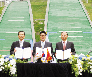 昨日,中国国家旅游局局长邵琪伟(右)、韩国文化体育观光部长官郑柄国和日本国土交通大臣大畠章宏在韩国签署中日韩旅游部长会议联合声明。根据声明,中日韩共同开发的10条旅游黄金路线,将与三国现有的旅游产品相结合,并推动制定三国“2020旅游展望”。新华社/文并图