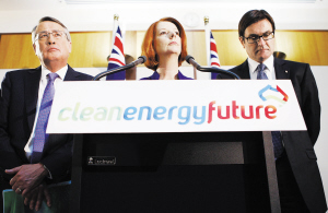 澳大利亚总理吉拉德(中)昨日宣布澳政府将对碳排放征税,价格为每吨23澳元(约合24.7美元),从2012年7月1日正式开始征收。吉拉德表示,政府计划的征收范围大约包括500家大型公司,但是暂时不对汽油征税。虽然吉拉德多次表示征税是为了达到改善环境的目的,但此举仍遭到反对党及能源企业的强烈抗议。(详细报道见第8版)新华社/文 CFP/图