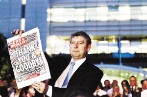 麦勒在该报东伦敦的总部外发表了一个简短的讲话。他手中拿着最后一期报纸说:“这是向我们750万读者和员工的最后敬意,感谢你们!”