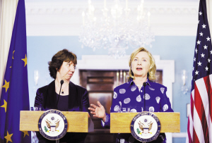 11日,华盛顿,美国国务卿希拉里在国务院会晤了到访的欧盟外交和安全政策高级代表凯瑟琳·阿什顿。希拉里身着一袭蓝色的中国韵味上衣很是惹眼。