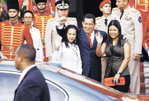 16日,在委内瑞拉首都加拉加斯,即将飞赴古巴接受第二阶段癌症治疗的委总统查韦斯(中),同两个女儿向公众挥手致意。