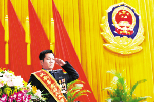 昨日,第四届“我最喜爱的人民警察”先进事迹首场报告会在北京举行。图为,湖北省武汉市公安局特警支队突击大队副大队长谭纪雄。商报记者 王聪/摄