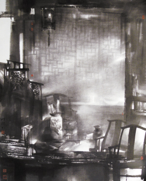 在陈辉的作品中,水墨意韵和光影效果是他所体现的主体。合理地将西方的空间和构成运用进来,结合中国画艺术中的意韵和意境,形成情景交融的和谐之美。他善于将墨的聚散、疏密自由调配,可谓纯粹的用墨“玩”色彩。作品均以黑白灰色调为主,通过晕染形成丰富强烈的视觉感,再通过光、通过结构、通过造型,把空间拉开。