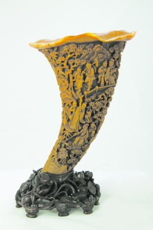 数百年来,犀角雕刻杯一直被奉为中国古代工艺品的主角,上乘之作犹如凤毛麟角,它们不仅做工精湛、美不胜收,亦兼具深厚的社会、文化和历史内涵。琴岛荣德此次秋拍夜场中推出的犀角精品多料大质好,雕工精湛。据介绍,清早期的犀角兰亭序巨杯,可谓犀角雕件中的少见珍品。雕件高25厘米,重995克,外壁雕东晋时期王羲之等人在山阴兰亭欢聚宴饮的故事。其杯壁8个人物,或抚琴、或吟诗咏句、或水边畅饮,姿态各异。杯色呈金蜜色,由一只巨型的印度犀角雕琢而成。器形硕大,刀法旷达有力,雕琢细致入微,将《兰亭序》中所表达的“虽无丝竹管弦之盛,一觞一咏,亦足以畅叙幽情”刻画得淋漓尽致。此外,犀角镂雕三国人物摆件也是一件难得的艺术珍品。