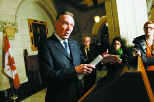 继2001年美国退出之后,加拿大环境部长彼得·肯特(图中)12日在议会举行的新闻发布会上宣布,加拿大正式退出《京都议定书》。日本和俄罗斯在德班气候大会期间也已表示不参加《京都议定书》第二阶段承诺期,其步加拿大后尘的可能性很大。《京都议定书》所能约束的就主要剩下欧盟,可谓名存实亡。(详细报道见第8版)商报综合报道 新华社/图