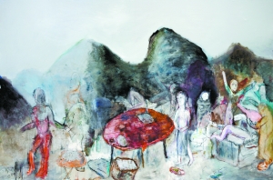 任小林始终对荒诞情有独钟,并掌控着荒唐的状态。这在他近日举办的“陌影·异色”展览中成为一次阶段性的集中展示。这种不确定的游离与他的迁徙、位移有着某种直接的关联。笔法写实,但画面叙述的却是一个非现实的情境。或许反复出现并漂浮在画面中的“陌影”,正是他“临界”于不同居住地“异乡人”的真实写照。他在与现实保持疏离的同时,在画面里呈现了非现实的意蕴。这种样式因为任小林更侧重直觉和体悟,因此可能会具有强烈的个人风格:无序的空间、杂乱的状态、异色的偏执、断续的线条等等是最容易呈现给我们的印象。作为任小林艺术的一个叙事线索与主题的一个侧面,他一直关注着人自身扭曲、诡异的状态,意味着他对于生与死、精神与肉体、伦理与欲望等诸多问题的思考和表现。