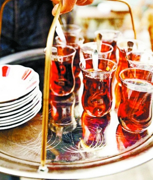 土耳其人爱喝茶,尤其是红茶。作为一个深受西方文化影响的国家,土耳其喝茶所用茶具区别于中国功夫茶,使用形状类似窄腰阔肚花瓶的玻璃杯、小匙、小铜碟。承载玻璃杯的小碟旁一般还要放3粒方糖。