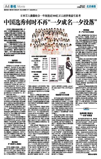 而在偶像选拔体制同样盛行的日本,一个通过选拔而产生的百人偶像组合AKB48,在经济持续低迷的情况下,去年为日本创造了近300亿日元的经济效益,着实令中国同行们“眼红”。对于中国的选秀明星产业链,日本AKB48的运作过程有哪些经验值得我们借鉴?