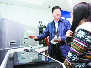 “笑容甜美的银行工作人员会通过视频与客户交流,‘手把手’地指导客户办理业务。”这个新奇的画面引来不少观众围观。记者在交通银行展台看到,两台型号不同的iTM设备前围满了参观市民,银白色的流线型设计科技范儿十足。机器正面的屏幕用来与银行工作人员进行远程视频通话,下方是触摸式操作屏,用来签名、输入个人信息、密码等。支票入口、出卡口、指纹扫描、身份证扫描、文档出口等模块分别排列在机身两侧。