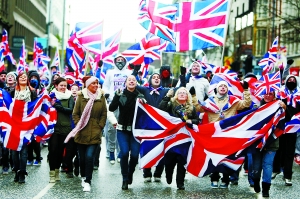 8日,英国北爱尔兰贝尔法斯特,皇室忠诚者在市中心举行示威活动,抗议禁止英联邦旗帜飘扬的相关限制。据英国媒体报道,贝尔法斯特市政府最新的国旗政策引发了这次示威活动。贝尔法斯特市议会经过投票决定大幅缩短悬挂英国米字旗的时间,将原本一年四季全天候悬挂英国国旗的政策改为每年仅在18个特定日期悬挂。CFP/图