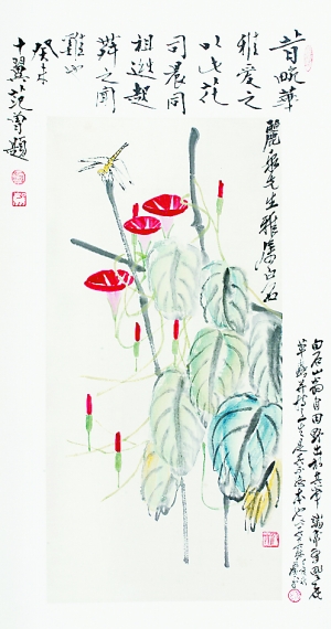 齐白石作品《牵牛蜻蜓》为不可多得的一件绘制牵牛花的佳作。李可染创作于1984年的《苍茫烟江夕照中》、《雨过云山图》以及李可染书李白的诗《西岳云台歌送丹丘子》等作品都是李可染先生晚年力作,代表了李可染的艺术成就,以期藏家之珍爱。
