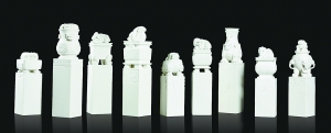 此套章为中国寿山石雕刻大师雕刻印章的代表作,取材寿山瓷白芙蓉石,色泽白皙如德化瓷,有如古人言“如脂如膏如腴”、“拂之有痕”之韵。寿山石印章的创作向来鲜有创新,不多的变换也多将印纽中的花果等造型、比例进行调整,形态加以变化而已。而此套作品彻底打破了寿山石章的固有范式,先将远古的鼎、瓶、尊、爵、钵等具有个性符号的器物制为印纽,再将瑞兽列于鼎瓶之上,使套章浑然一气的结为整体,前无古人、匠心独运。此套印章作品,刀法老练遒劲,运刀或深刻或薄意。自古以来鼎瓶便是权力的象征,瑞兽是传统吉祥题材,鼎瓶的厚重、瑞兽的和谐、套章的内涵,皆令人称道。