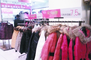无论是王府井、西单还是崇文的各大百货店、购物中心内,几乎所有的服装品牌都在进行促销。在王府井百货的波司登精品羽绒服专区内,记者看见“波司登新款羽绒服满200减50”的标牌赫然其中。实际上新款羽绒服的促销活动不只如此,在众多羽绒服中,有三排标着“319元”、“399元”、“549元”抢购价新款羽绒服。