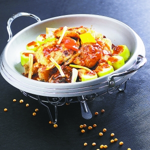 制作:首先将鱼头剁成约2cm厚的小块,然后下盐糖和生粉腌制10分钟,下油在特制的煎锅爆香姜、葱、蒜,再下鱼头煎至两面金黄色约七成熟,最后用少许上汤“开匀”黄豆酱淋在鱼头上加盖焗2-3分钟,加少许丝瓜点缀即可。