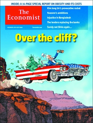 “财政悬崖”是美联储主席伯南克所创造的术语,指2013年初美国经济将面临增税和开支削减的打击(除非政界就如何规避达成协议,否则这种打击无可避免)。伯南克并不以独特辞藻而知名,但“财政悬崖”这个术语激发了人们的灵感,一些歌曲和电视脱口秀随之产生——讽刺歌手默尔·哈泽德轻声哼唱:“财政悬崖是一块危险地带/预算荡然无存,成人并未却步。”而乔恩·斯图尔特在《每日秀》中称财政悬崖为“悬崖末世决战之灾”还有一些更为严重的后果。“财政悬崖”的阴影让公司投资萎靡不振,美国的消费者信心已经开始动摇。经济增长正在放缓,四季度增长率可能仅为1%。全球的决策者焦虑不安:澳大利亚央行把“财政悬崖”视为隐忧,日前下调了利率。