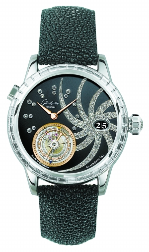 格拉苏蒂在圣诞节推出的这款腕表,每一位心中充满童真与奇幻梦想的女性而设计,满载着德国萨克森州制表大师们的浪漫以及对女性的无限宠爱。 白金表壳呈现纯净线条的高贵质感,表壳上镶嵌44颗梯形切割的钻石。黑色雕面盘上方散落开来的美钻犹如繁星,呈现童话故事般的灵气动人。