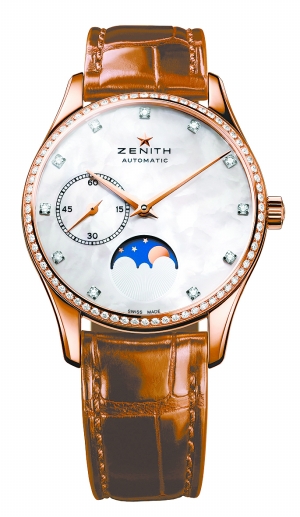 真力时Ultra Thin超薄女装月相腕表搭载了性能无可匹敌的Elite超薄机芯,拥有超过50小时的动力储存,而厚度仅为3.97毫米,适合于女性的纤细手腕。腕表配备珍珠母贝表盘,表冠和时标铺镶钻石。9点位置的小秒盘,6点位置的月相窗口,在微妙的不对称布局中洋溢古典之美。