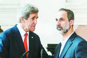 图为2月28日,意大利罗马,美国国务卿克里(左)会晤叙利亚反对派联盟领导人穆瓦兹·哈提卜。CFP/图