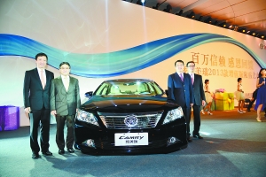 3月13日,广汽丰田宣布凯美瑞国内销量突破100万辆,以6年9个月同级别车中最短时间挺进“百万辆俱乐部”。当天,凯美瑞“2013款增值版”也宣告上市,新增三款车型,17.98万元起售。同时,广汽丰田还开展了“百万信赖,感恩回馈”主题活动。