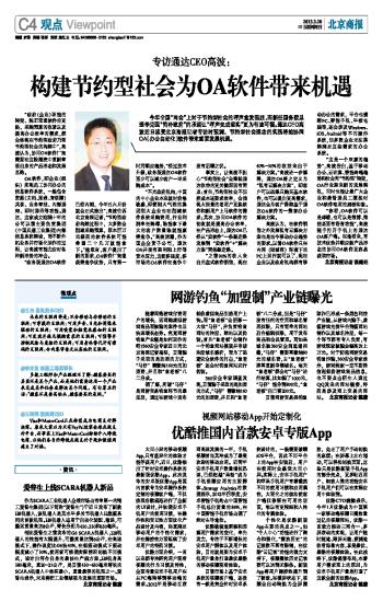 今年全国“两会”上对于节约型社会的呼声愈发强烈,而新任国务院总理李克强“简朴政府”的承诺让“呼声变成现实”更为有迹可循。通达CEO高波近日接受北京商报记者专访时预测,节约型社会理念的实践将给协同OA(办公自动化)软件带来重要发展机遇。