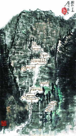 此幅《山居图》在饱满构图中,山势携着坚实的笔调迎面而来,绵绵密密地深入到画面的每一个角落;重重叠叠的山峦中,一条细长的山路贯穿,如龙蛇穿行在层峦叠嶂之间,又在密不透风笔墨交融的布局置景中,点缀上房屋,从而在繁茂的情境中,取得了满而不塞、不空而灵的表现效果,使画面充满了质感、灵感和动感,与古人的“密不透风,疏可走马”不谋而合;山前的翠树清晰可见,山中的翠树则隐约朦胧,墨色与山色交相融合,通过山峦轮廓曲线的变化以及光影的变化使得山的层次与立体感完全凸显。这一切由表及里多层次的交织,使他的画面给人以强烈的视觉冲击力和艺术感染力。