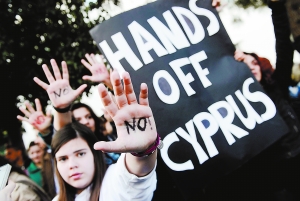 塞浦路斯,一个GDP只占欧元区0.2%的南欧小国,却因一场金融救助案引发全球市场动荡。欧元集团将对深陷债务危机的塞浦路斯提供100亿欧元援助,但前提条件是塞银行储户要根据存款数额支付一次性税收,10万欧元以上存款的税率为9.9%,10万欧元以下为6.75%。图为民众抗议征收存款税。 (详细报道见第8版)北京商报综合报道 CFP/图