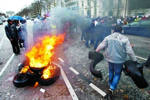 18日,法国巴黎,标致雪铁龙雇员在公司总部外示威。他们焚烧轮胎,并与防暴警察发生冲突,抗议公司关闭工厂及裁员。