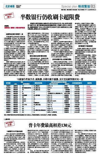 同时,各家银行的金卡收费在100-300元/卡,相差200元。其中工商银行和兴业银行最低,为100元/卡;最高的为民生银行、平安银行及招商银行,都为300元/卡,浦发银行普卡及金卡的收费标准相同,都为180元/卡。