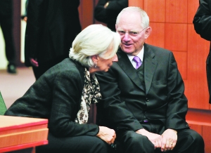昨日,欧元区各国财长同意批准此前由塞浦路斯和欧盟、国际货币基金组织(IMF)、欧洲中央银行三方国际救助机构达成的新救助协议,暂时为塞浦路斯经济的不确定性划上终止符。图为IMF总裁拉加德(左)和德国财长朔伊布勒(右)出席欧元区财长紧急会议。(详细报道见第8版)北京商报综合报道 新华社/图