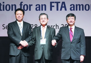 中日韩自由贸易区(FTA)第一次谈判会议昨日在首尔举行。自2002年建立FTA构想首次提出,时间已过去十年有余。去年5月,中日韩关于促进、便利和投资保护协定的签署为三国启动自贸谈判创造了条件。图为中国首席代表俞建华(左)、日本首席代表鹤冈公二(右)及韩国首席代表崔京林合影。(详细报道见第8版)北京商报综合报道 新华社/图