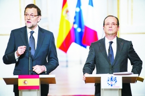 26日,法国巴黎,法国总统奥朗德(右)与西班牙首相拉霍伊举行会晤并召开联合记者会,称要求银行储户承担大量损失的塞浦路斯救助协议是特例,而非模板,不会被其他国家复制。拉霍伊表示,救助计划是仅适用于塞浦路斯的特例。CFP/图
