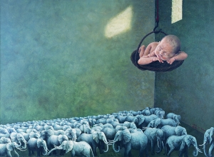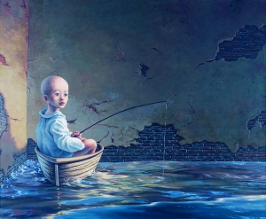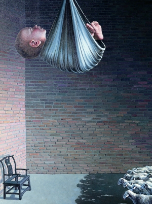 北京商报:您的作品多以超现实画面来呈现,“光头”小孩是您画面中出现最多的人物,有的在独自飞翔跳跃,有的在画面中形成了自己的王国,而这些孩子中也许都有您自己的影子,童年的经历在您的成长中似乎有着挥之不去的影响。