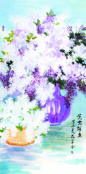 谈及创作,杨翠金认为,“画面不是题材的拼凑,需要背景、颜色等的互相衬托,利用巧妙的色彩点缀、精妙的花鸟布局等来丰富画面意象,自然而然达到画面的和谐。正所谓:‘笔墨将至,然意境天成’”。在她的作品中,玫瑰的热烈奔放、浪漫激情;丁香的清香淡雅、娇艳妩媚;牡丹的端庄大气、清丽不俗;荷花的清纯脱俗、恬然超逸……其画有一种魄力雄健、兴趣酣足、轻松飘逸之感,作品中所呈现的那种自然生动,构成了赋色淡雅、清新畅快、墨酣意足、雅俗共赏的艺术风格。